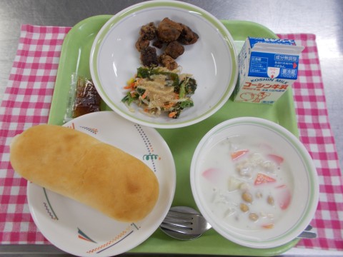 コッペパン&いちごジャム、鯨の竜田揚げ、ごまドレサラダ、ミルクスープ、牛乳
