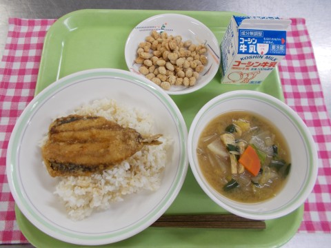 鰯の蒲焼き丼、具だくさんみそ汁、きなこ豆、牛乳