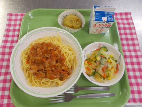 トマトスパゲッティ、キャベツサラダ、スイートポテト、牛乳