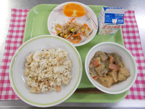 鮭ご飯、鶏肉と生揚げのごまみそ煮、ツナと野菜の和え物、果物(せとか)、牛乳