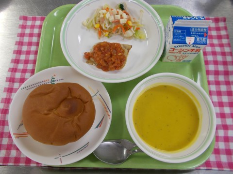 黒砂糖パン、魚のプロヴァンス風、クルトンサラダ、かぼちゃとさつま芋のポタージュ、牛乳