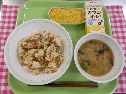 深川飯、具だくさん玉子焼き、さつま芋のみそ汁、カフェオレ