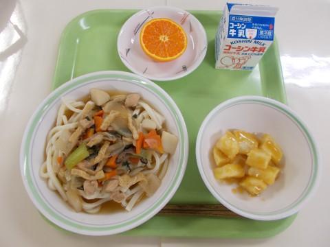 けんちんうどん、みそポテト、果物(カラマンダリン)、牛乳