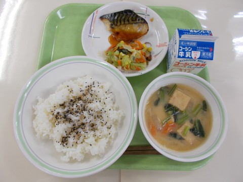 ごまごまご飯、鯖の照り焼き、海藻の和風和え、新玉ねぎのみそ汁、牛乳