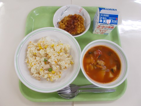コーンピラフ、クリスピーフィッシュ、あさりのトマトスープ、牛乳