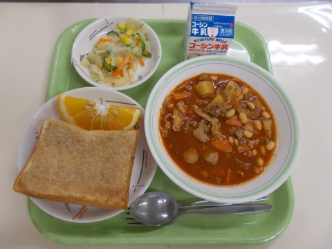 セサミトースト、ポークビーンズ、春野菜サラダ、果物(完熟甘夏)、牛乳