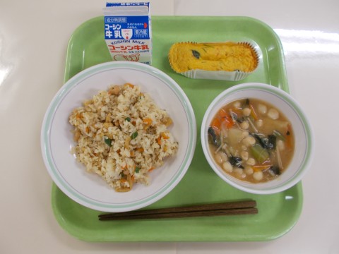 昆布ご飯、おから入り玉子焼き、白玉麩のみそ汁、牛乳