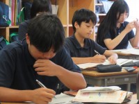 また、協働的な学びとしては、班で練習用紙を互いに見せ合って助言したり、早く丁寧に書くコツを共有し合ったりしていました。この授業の取り組みが、夏休みに行う職場体験のお礼状作成に、きっと役立つに違いありません。