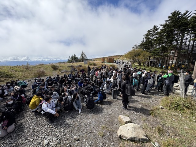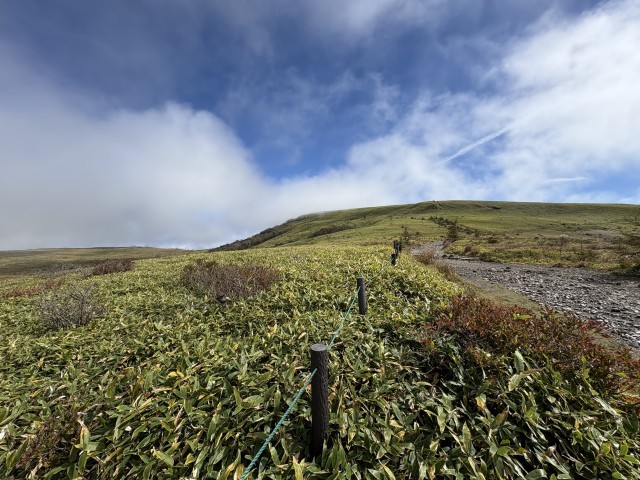 車山肩駐車場に到着しました。これからガイドさんの先導で山頂を目指します。雨は降っていないものの、ご覧のとおりの霧がかかっているため、山頂からの眺望は期待できそうにありません。
