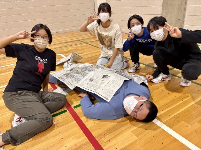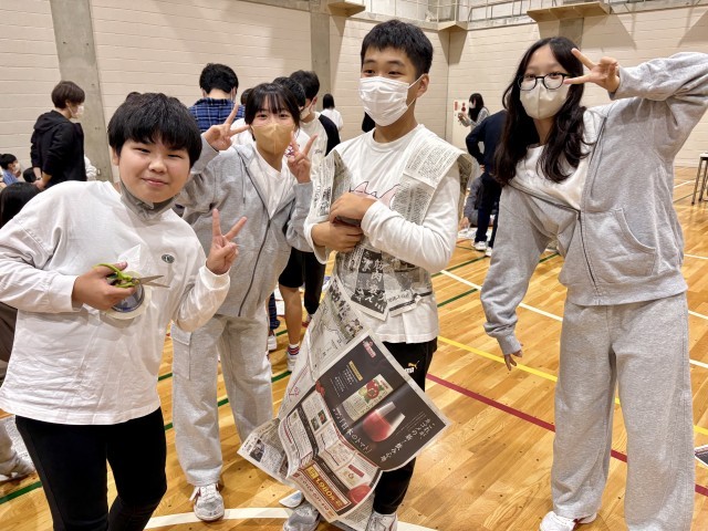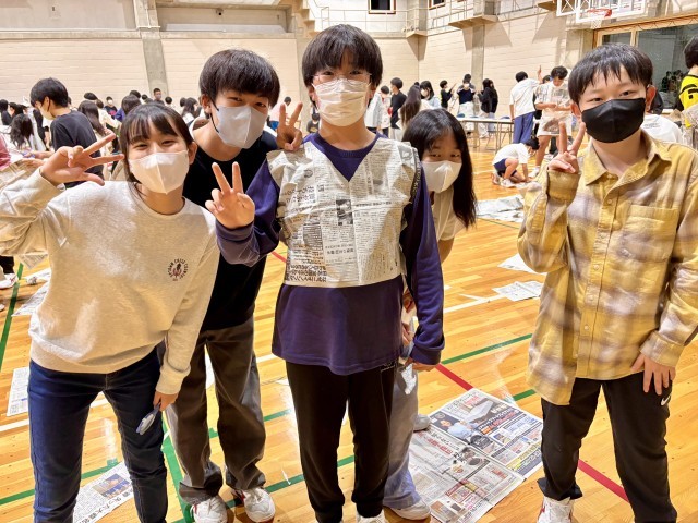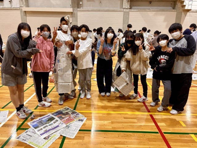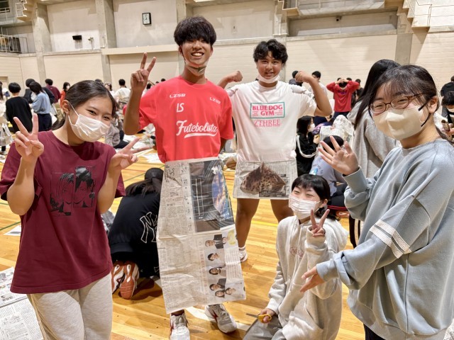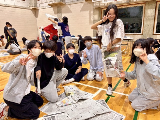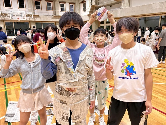 開催されたのは「新聞紙によるファッションショー(コンテスト)」です。実行委員の皆さんが企画したこのイベントは、ホールに集合してから明らかにされたため、発表の瞬間はどよめきが起きていました。