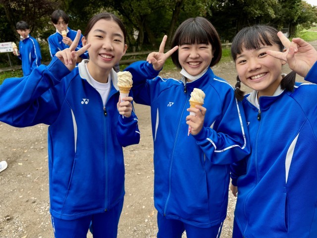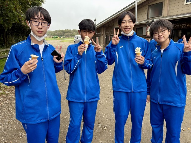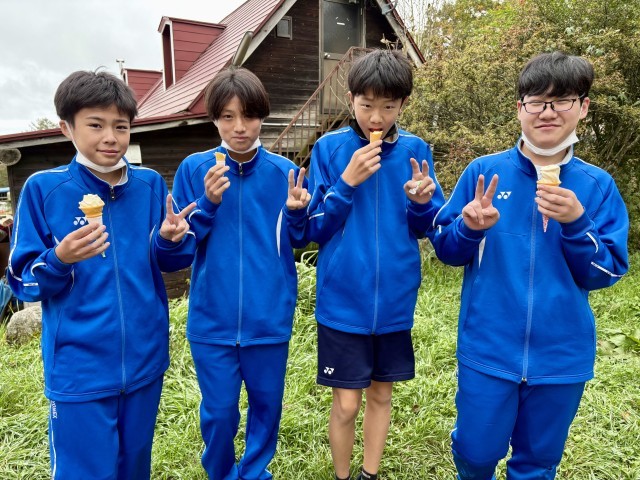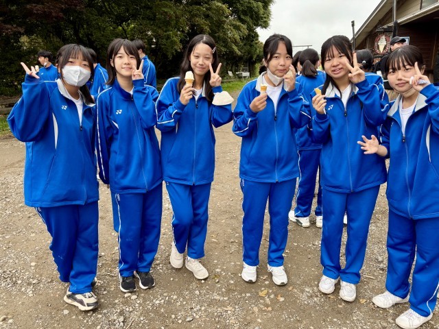 写真は、4組の皆さんです。滝沢牧場名物のソフトクリーム体験(試食)の様子です。他クラスの人も、少し混じっています(記事に隠れた写真は【➕】をクリックしてください)。
