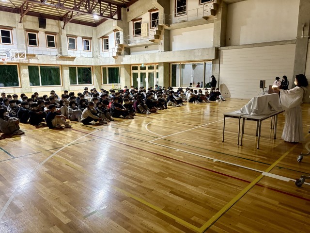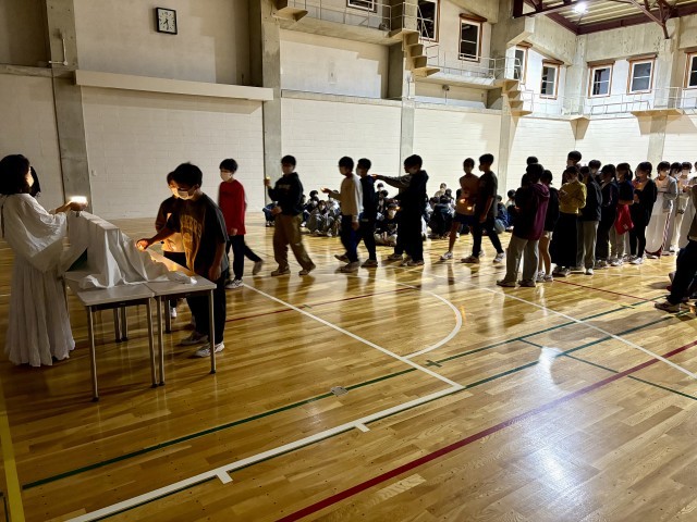 まずはLEDを使ったキャンドルサービスで幕を上げた出し物は、5組の皆さんの「最後の学活」と題されたコント&合唱で始まりました(記事に隠れた写真は【➕】をクリックしてください)。