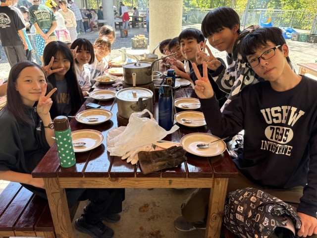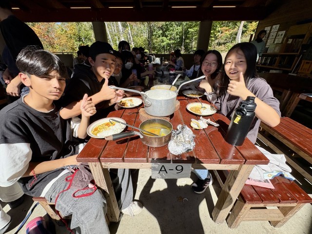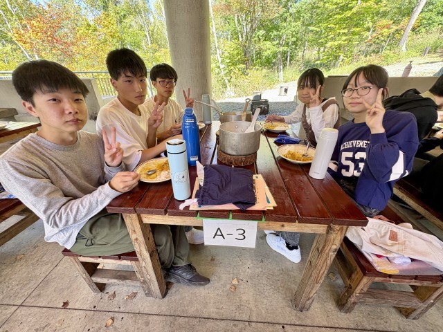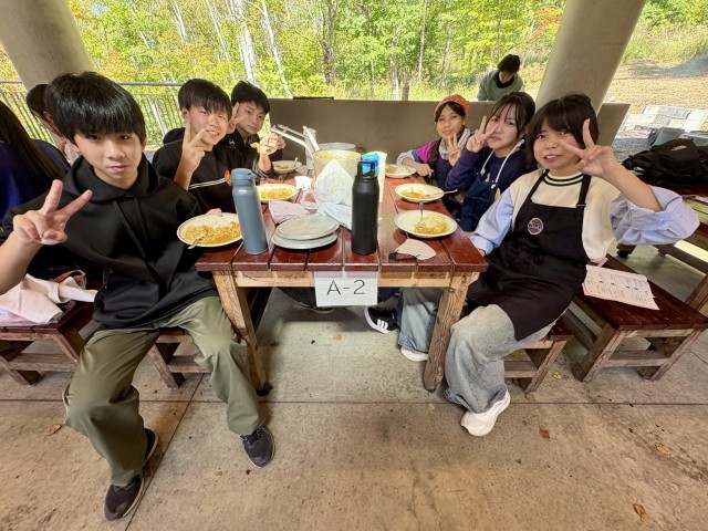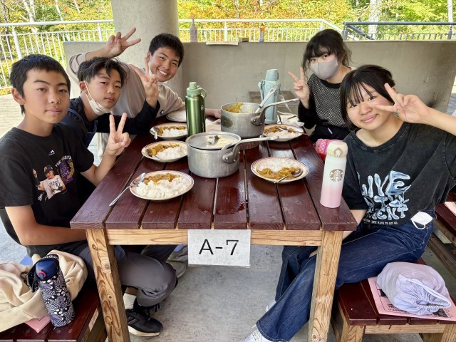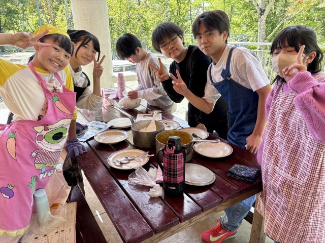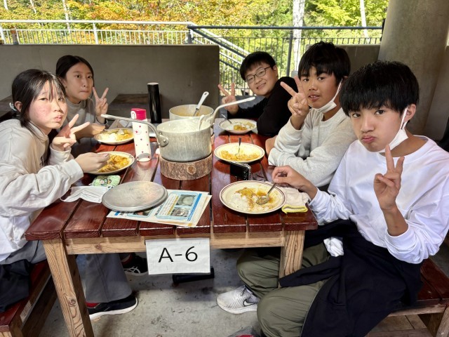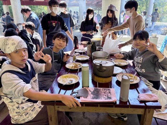11時前後から、辺りに食欲をそそるスパイシーな香りが漂い始め、いよいよカレーが完成しました。今日は予報以上に好天に恵まれ、爽やかな空気に包まれながら美味しくいただいています。