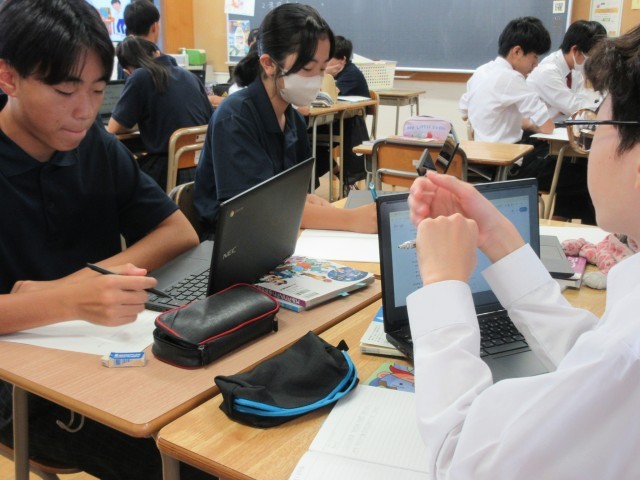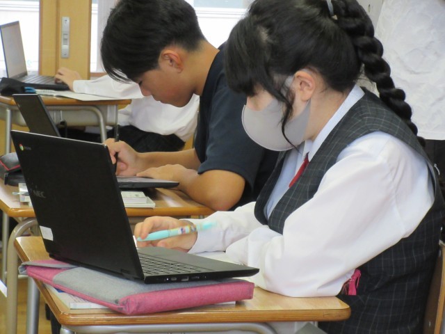 授業の冒頭、ジャッキー・チェンさん主演のヒット映画『酔拳』の一部が流されました。お酒を飲むほどに(酔うほどに)強くなる主人公を描いたアクションコメディ映画です。その後先生から「なぜ飲酒運転は許されないのか」「なぜ未成年に飲酒は禁じられているのか」という質問が投げかけられ、調べ活動を行いました。