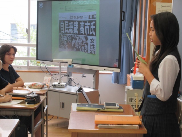 取り上げたニュースの記事やネット画面を電子黒板に映し出し、200字以内でまとめた記事の要約や、400字以上で書いた考察を発表します。〇〇さんは写真にもあるように【自民総裁 高市氏】の号外を使用して発表していました。
