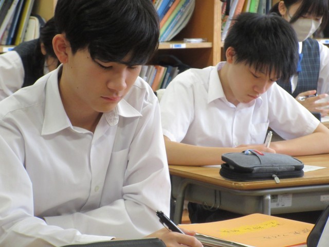 発表を聞いている人は、相互評価用紙を記入します。そこでは記事・ニュースのタイトルを書く他、要約・考察の分かりやすさや聴き取りやすさを5段階で評価します。そして、短いコメント(感想)も書くので、ぼんやり聞いているわけにはいきません。発表者はもちろん、クラスメイトにとっても時事問題を知る良いきっかけになっています。