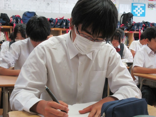 教室にお邪魔したとたん、担当の先生から「校長先生は、中学時代に将来の夢を決めていましたか」との無茶ぶり質問。ただ、中学生時代に書いた「将来の夢」という作文の内容を覚えている私は「決めていました。会社員です」と即答しました。結果として夢は実現していませんが、当時そんな作文を書いた理由はこのクラスの人に聞いてください。