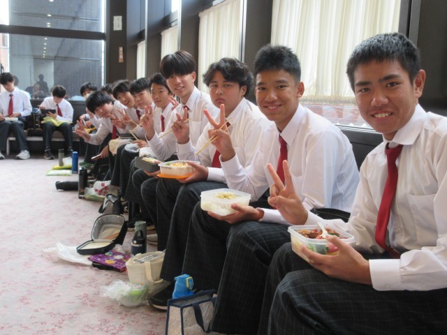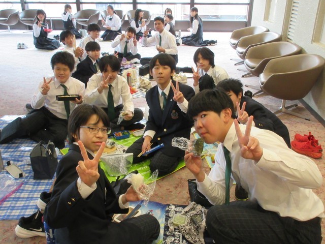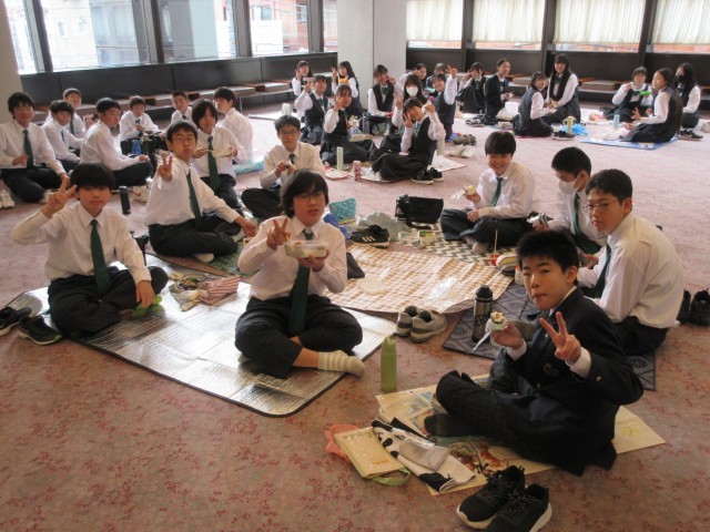 8年生の合唱発表で午前の部が終了、昼食タイムとなりました。ロビー等にレジャーシートを敷いて、お弁当を食べました。