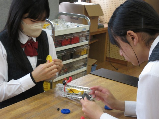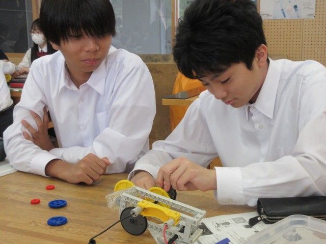 『エネルギー変換に関する技術』の学習で、発電モータや各種ギヤ(歯車)、フレームなど31種のパーツを組み合わせ、自動車モデルを製作しています。これまでに、歯車の組み合わせ方による回転速度や、タイヤなどを回転させる力を考察してきました。