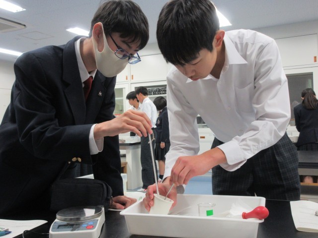 もう1つは、水酸化バリウムと塩化アンモニウムを混ぜ、やはり同じように温度を測ります。前者は発熱反応が起こって温度が上がり、後者では吸熱反応によって温度が下がることを確認できました。