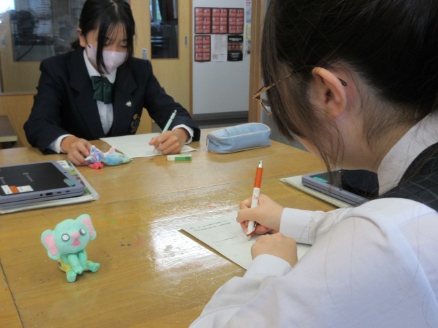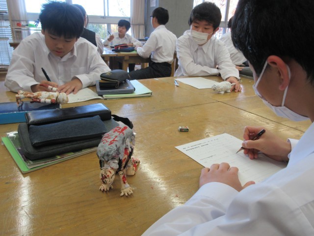 3~4名のグループ内で作品を見せながら、妖怪名や妖怪の特徴を説明します。説明を聞いた友達は、鑑賞文をワークシートに記入します。このクラスでは制作中の授業も取材したことがあり、鑑賞会も興味深く拝見しました。