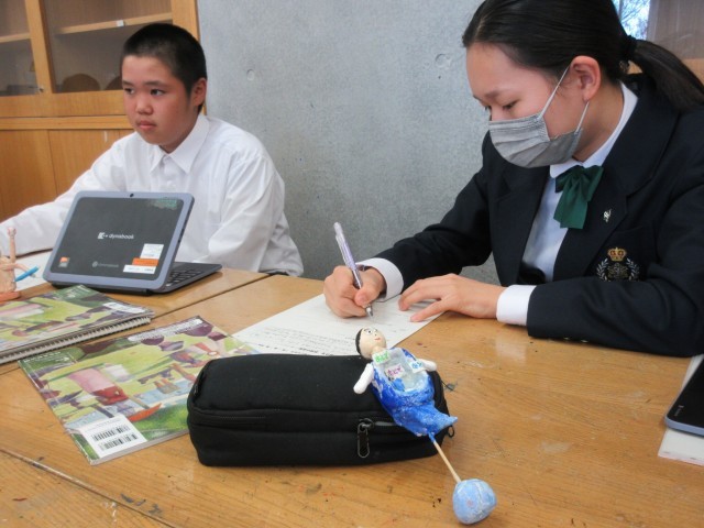 紙粘土で制作した『私の中にいる妖怪』が完成しました。自分の心や行動で「弱い」と自覚できる部分を、あえて「妖怪」として表現しています。この時間は、完成した友達の作品の鑑賞会でした。