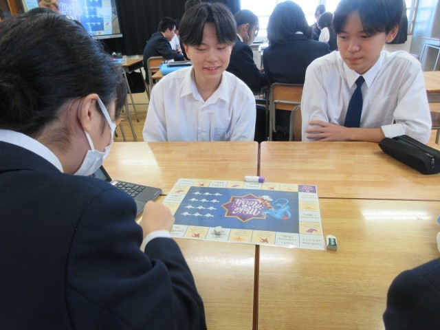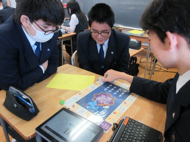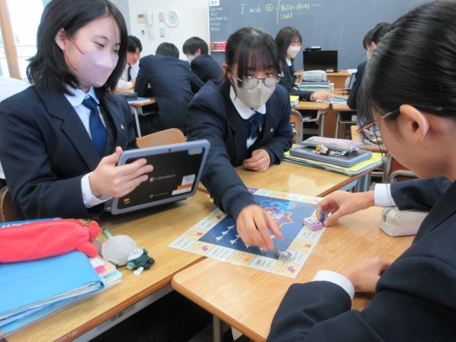 授業では、先生のつくられたオリジナルすごろくを使って練習しました。自分のコマが止まったマスで指定された「どこに行きたいか」「どんなペットが欲しいか」等の英文を作ります。その際には、英文そのものよりも「実現がきわめて難しい」という条件をクリアするのに苦労している人が多いようでした。