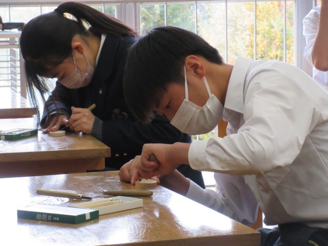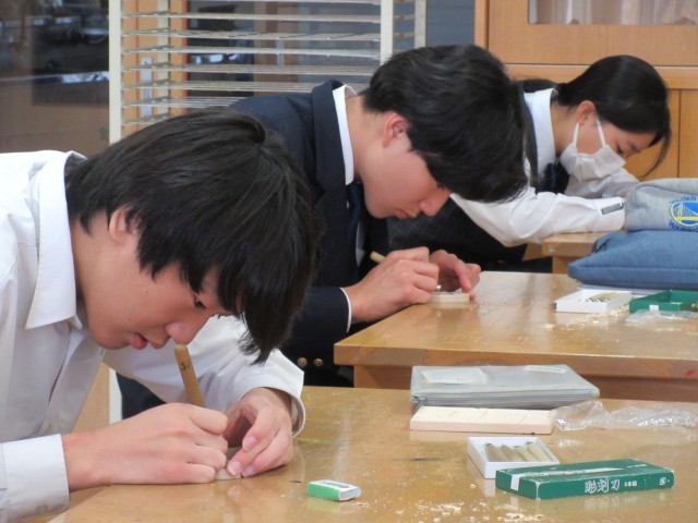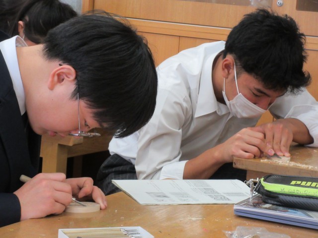 特に彫刻刀は使い方を誤るととても危険なので、柄の持ち方や彫り方をしっかり確認しました。そのうえで、薬研彫りやかまぼこ彫り、浮彫りなどの彫り方の違いも確認し、実際に練習用の木片を彫ってみました。