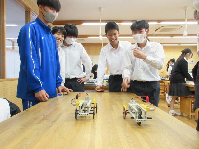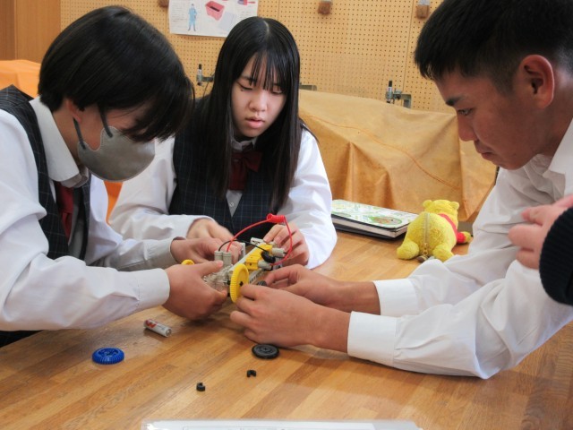 『エネルギー変換に関する技術』の学習で、発電モータや各種ギヤ(歯車)、フレームなど31種のパーツを組み合わせ、自動車モデルを製作しています。この時間は「速さ」を追求した自動車モデルを製作していました。