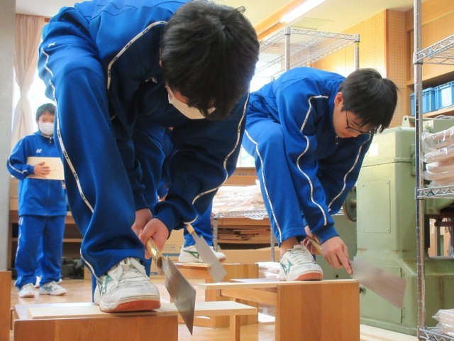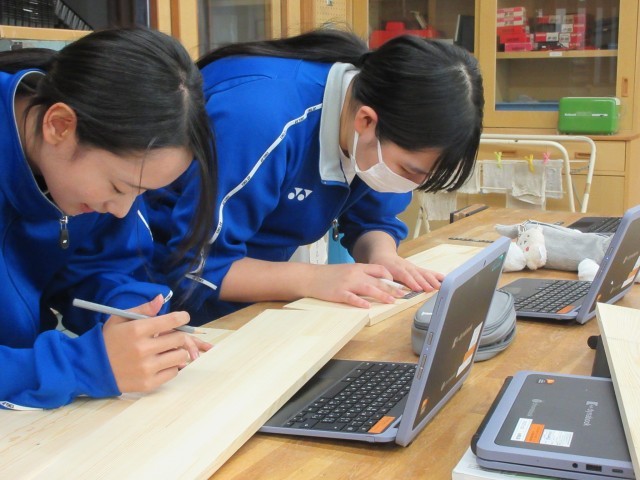 実習『木材加工』に取り組んでいます。3枚の集成材(大2枚・小1枚)から、小物入れやラックなど自分で設計したものを製作します。その設計は、部品図や完成図などが分かりやすく表示される3Dアプリを使用しました。