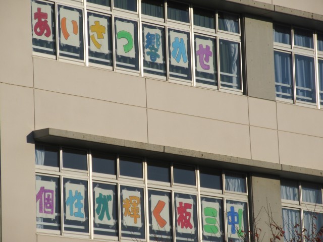 また、時を同じくして新しく発足した生徒会が、新しいスローガン【あいさつ響かせ 個性が輝く板三中】を校舎の窓に掲示しました。元気な挨拶で、インフルエンザ等の感染症ウィルスも吹き飛ばしてほしいものです。
