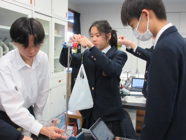 そして、おもりのもつ位置エネルギーの変化量と発電した電気エネルギーを求め、その比率を調べました。8年生の『電気の世界』や技術の授業のい『エネルギー変換の技術』など、他学年・他教科の知識も必要な実験でしたね。