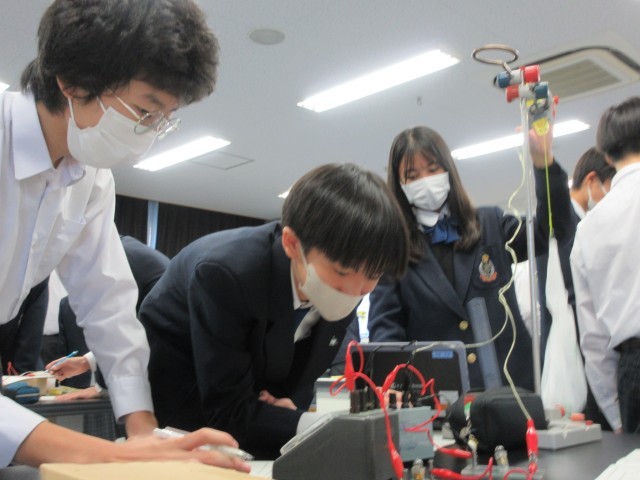 この時間は、そのようにエネルギーの形態が変わると、総量はどうなるかを調べる実験に取り組んでいました。発電機、豆電球、電流計、電圧計を使った回路をつくり、おもりを落下させたときの電流、電圧、落下時間を計測します。