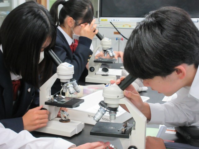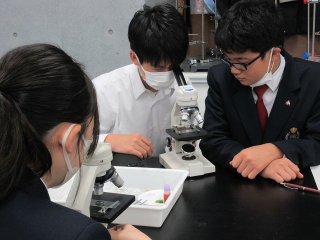 新しい単元『生物と細胞』に入りました。この時間は「生物のからだの顕微鏡観察」に取り組んでいます。まず植物の細胞観察に使っていたのは、水草の1種のオオカナダモです。自分でプレパラートをつくって観察します。