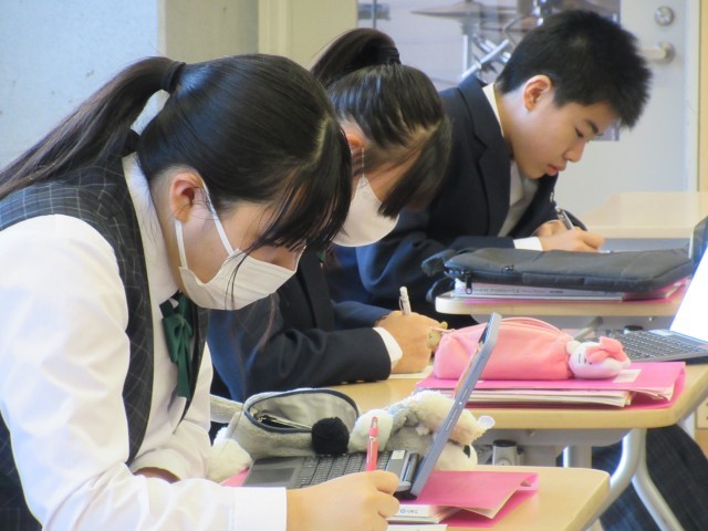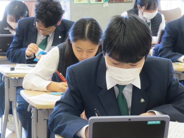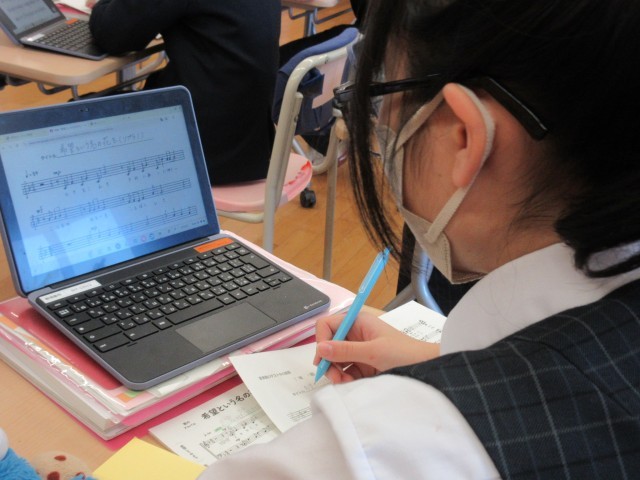 授業前半は、合唱曲『希望という名の花を』の写譜に取り組んでいました。写譜とは、文字どおり楽譜を書き写すことです。Chromebookに貼り付けられたパート別の楽譜を見て、自分のパートだけを紙に写し取っています。