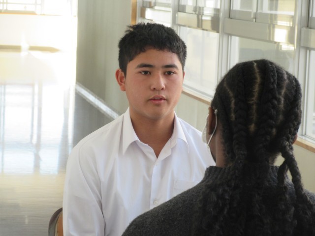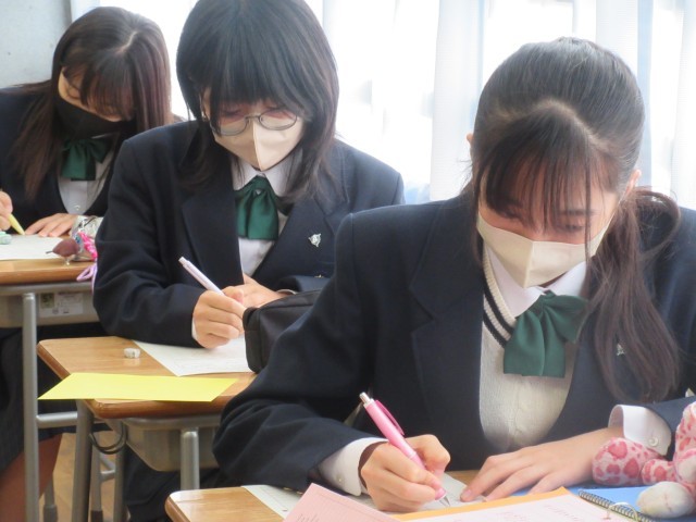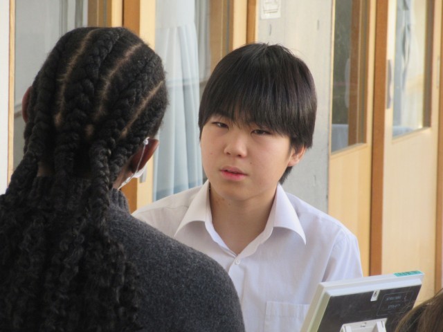 この時間は、そんな「やりとり」に関するパフォーマンステストを行っていました。1人ずつ廊下に出て、ALTの先生を相手に英語でやりとりします。とはいえ、事前にある程度の準備はしました。
