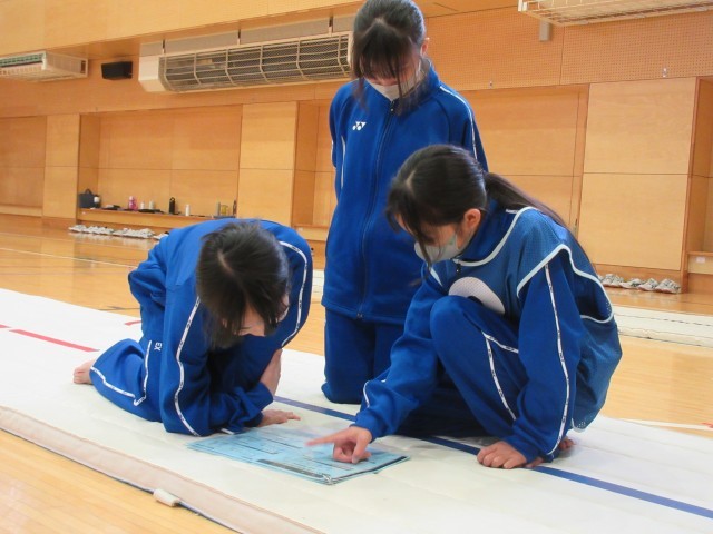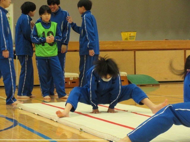十分に体をほぐした後で、いよいよ自分の取り組む技の練習かと思いきや、先生から「研究タイムです」との声がかかりました。取り組む技のポイントが示されたシートをグループごとに持ち寄り、皆で確認しました(写真・中)。そうした過程を経ているからでしょうか、技の練習に入るとお互いに助言・補助し合う姿が各グループで見られました(同・下)。