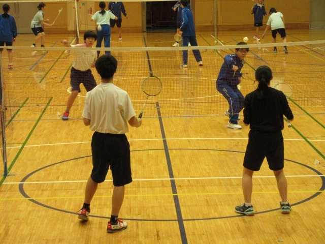 冬休みも最終日となり、部活動の参加者も増えてきました。バドミントン部も前回の練習より大幅に増え、ネットを挟んでの基礎打ち練習も前後半2組に分かれて行っています。一方で、壊れていたネット支柱が新しくなってコートが1面多くなったぶん、少しは混雑が緩和できたようです。