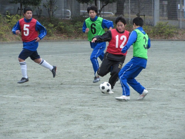 サッカー部の練習開始時刻は8時と早かったこともあり、練習を始めたころは小雪まじりの天気でした。取材をしている私もすっかり体が冷え切ってしまうほどでしたが、3チームに分かれてミニゲームを行うサッカー部の皆さんは、額に汗を浮かべながらコート狭しと走り回っていました。