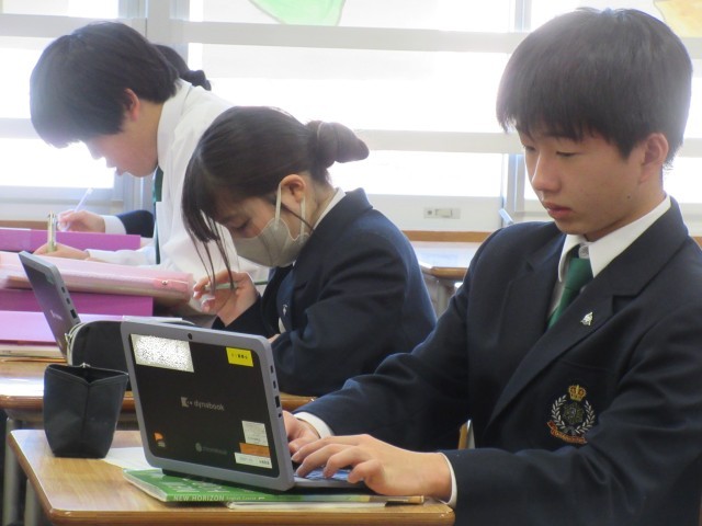 前の授業で「冬休みの思い出」について、友達と英会話で報告し合いました。「話す」活動のうち「やりとり」 の学習ですが、この時間は同じ「話す」活動でも「発表」の学習です。冬休みの思い出を10文程度の英文にまとめ、クラス全員に発表するスピーチ原稿の作成に取り組んでいました。