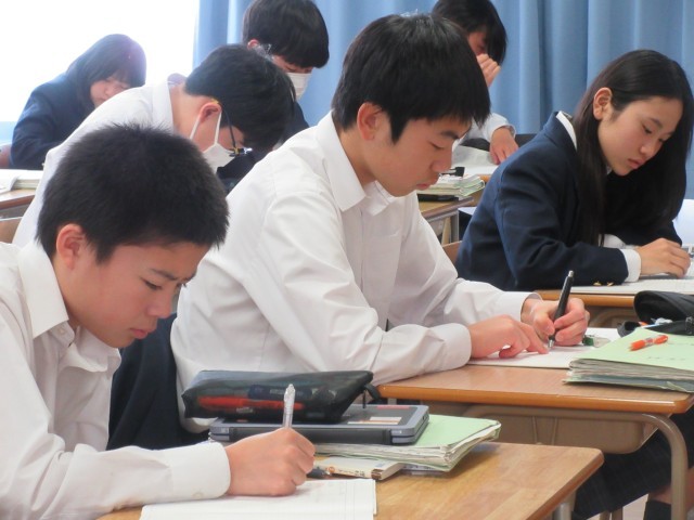 【写真・下】9年3・4組 数学(少人数)の授業の様子です。