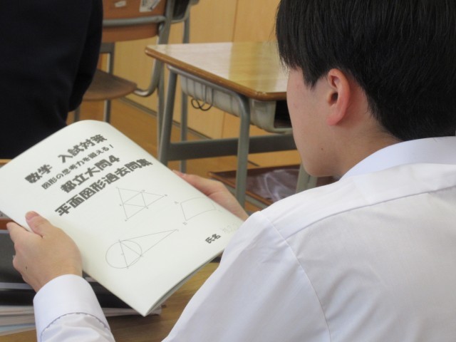 「都立大問4」と書かれた表紙と数枚のプリントが配られました。「大問4」とは、都立高の入試問題の大設問4番のことで、例年そこでは「平面図形」の問題が出されます。その「平面図形」に特化した過去問が配られていたのですが、その他にもこうした大問別(単元別)の過去問が用意され、各自の苦手分野に取り組むことになります。