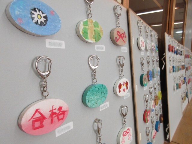 【写真・下】9年生の『木彫キーホルダー』です。