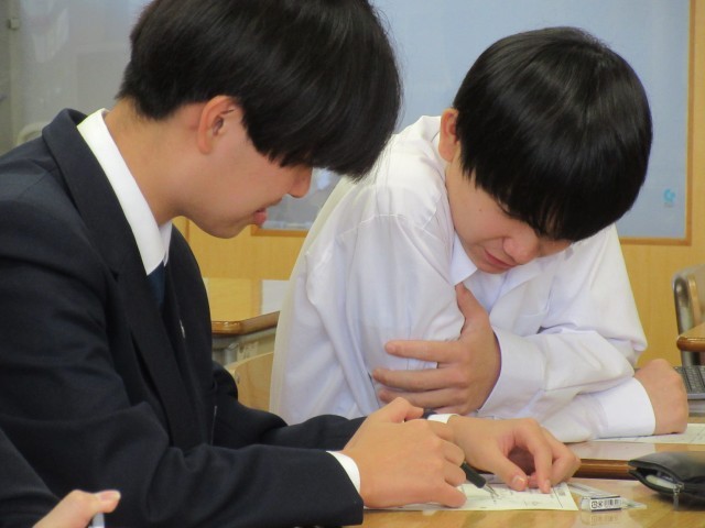 この授業ではさらに発展的に、長方形の中で角を挟む2辺と接する大小2つの円について、それぞれの中心を結んだ線分の長さを求める問題などに取り組んでいました。この問題の場合、分かっているのは長方形の2辺の長さだけです。私なら途方に暮れそうな問題も、これまで蓄えた知識や思考力を総動員して解いていました。