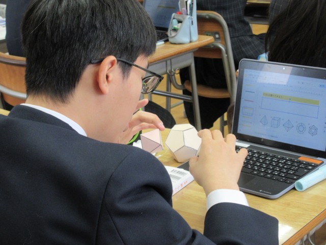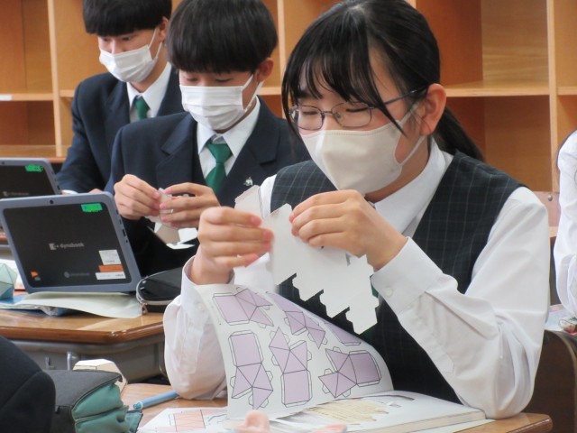 廊下から教室を覗いたところ、和やかに工作のようなことをしていたのでお邪魔しました。教科書巻末の付録を切り取り、正多面体を組み立てていました。平面を切り抜き、立体にトランスフォーム(変形)させている感じです。