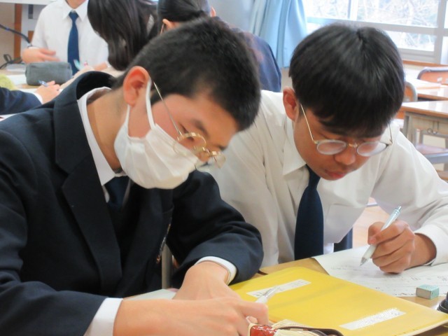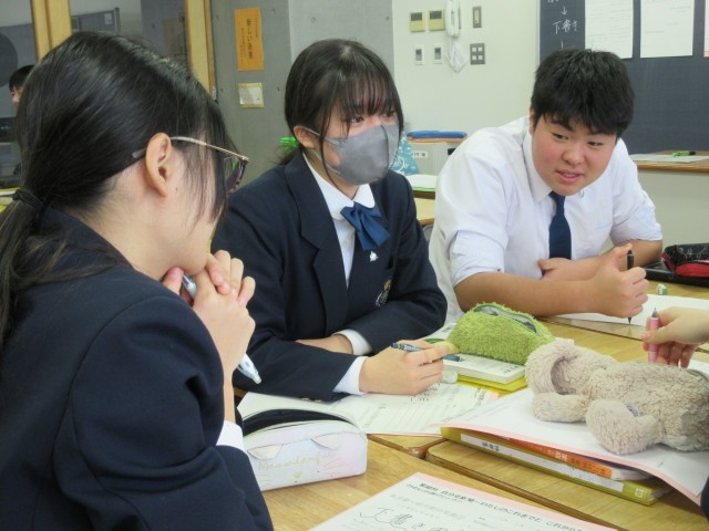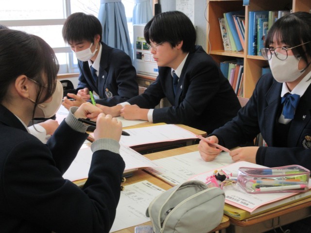 この時間は最初の授業なので、友達とアイディアを出し合ったり思い出を語り合ったりしながら作業を進めていました。今後は入試日程の関係で不在になる人もいるため、貴重な協働学習の時間になっていました。