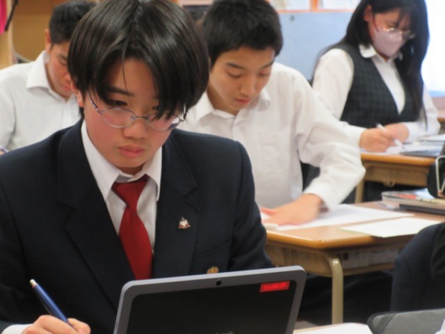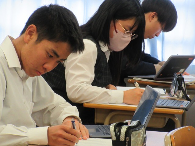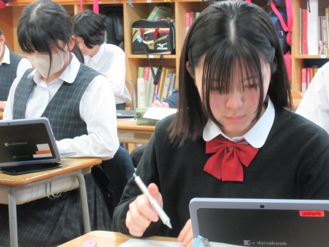 前の授業で、雪舟など優れた画家の水墨画を鑑賞し、単色だからこそ生み出せる味わいや特性を確認しました。そして、実際に墨と筆を用いて、濃淡を使い分ける横線を何本も描いてみました。