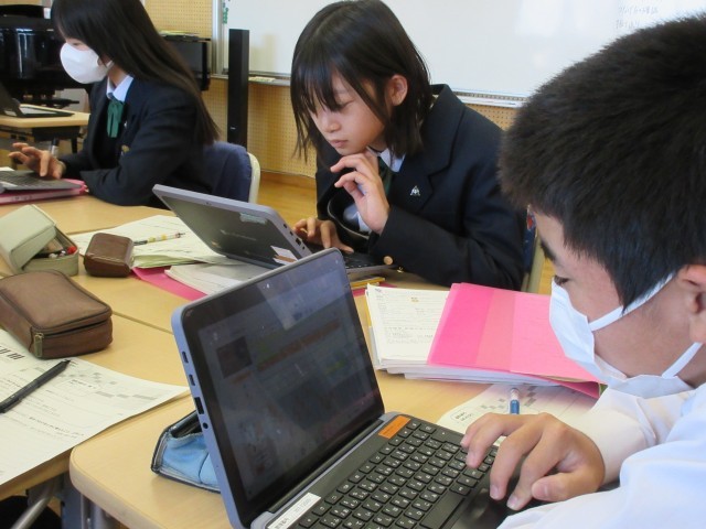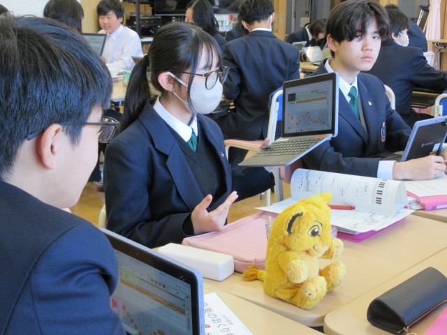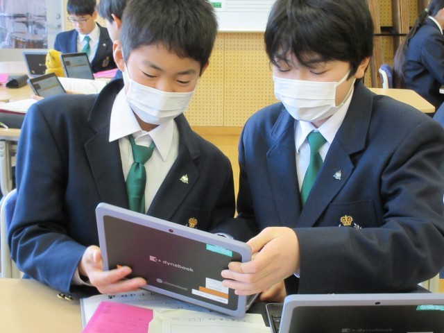 この時間は、その「創作」に取り組んでいました。音楽アプリを使い、5つの音だけを使った五音音階で旋律をつくります。すでに班ごとに、五七五のリズムで歌詞をつくっています。【散歩道 ザクザク足音 しもばしら】【雪が降り サンタが走る 銀世界】など、冬の世界を詠んだ歌詞を班員で相談してつくりました。