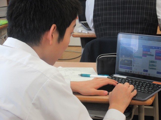 情報に関する技術『プログラミング』の実習です。簡単に言うと「プログラミング」とは「コンピュータに実行させたい仕事(処理)の指示を出すこと」です。日常生活の課題解決を図るプログラミング作品を、マイクロビットという学習教材を用いて制作しています。まず、その課題を自分で設定し、それをどのように解決するかを考えました。