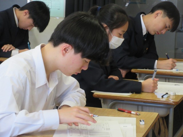 この時間も、都立高受検対策の模擬トレーニング(通称『模擬トレ』)に取り組んでいました。「模擬」という言葉からもわかるように、問題数・内容・難易度など都立高入試の共通問題レベルです。